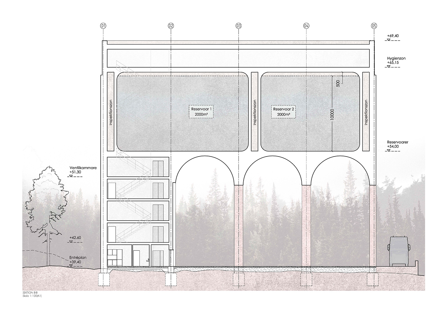 För att minimera inverkan i naturen är det endast under de två benen som det finns en pågjuten bottenplatta. Mellan pelarna får de vackra berghällarna råda. I och med platsens höga naturvärden anläggs det heller inga nya gångvägar utan besökaren leds upp av sin egen nyfikenhet endast lätt guidad av arkitektoniska element, omsorgsfullt placerade längs med platsens naturliga stråk, som utformas för att materiellt och formmässigt hänga ihop med vattentornet.