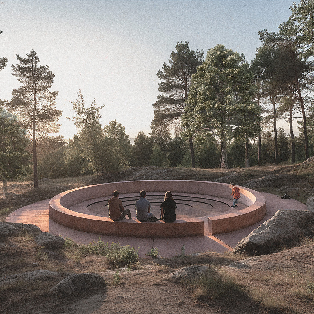 Väl uppe på toppen möts man av vattentornet och den vackra hällmarken. Landskapet kompletteras av en ensam ring av rödpigmenterad betong där kan man sitta och uppleva naturen och arkitekturen både som ensam vandrare eller som del av en skolutflykt.